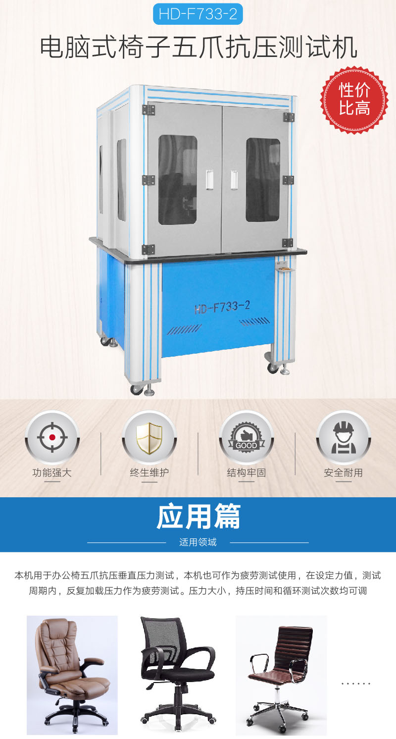 電腦式椅子五爪抗壓測試機HD-F733-2也叫“五腳靜壓試驗機”,用于辦公椅五爪抗壓垂直壓力測試,本機也可作為疲勞測試使用,在設定力值,測試周期內,反復加載壓力作為疲勞測試。壓力大小,持壓時間和循環測試次數均可調。 設計標準: 1.設計標準:GB/T16491 2.測試標準:ASTM D903,F2258,GB/T 2790/2791/2792, CNS-11888,JIS K6854, GB/T 6329,BS EN 14410-2003,YY/T 0729,GOST 21751,BIFMA X5.1-2011 7,QB.T2280-2007 | ||