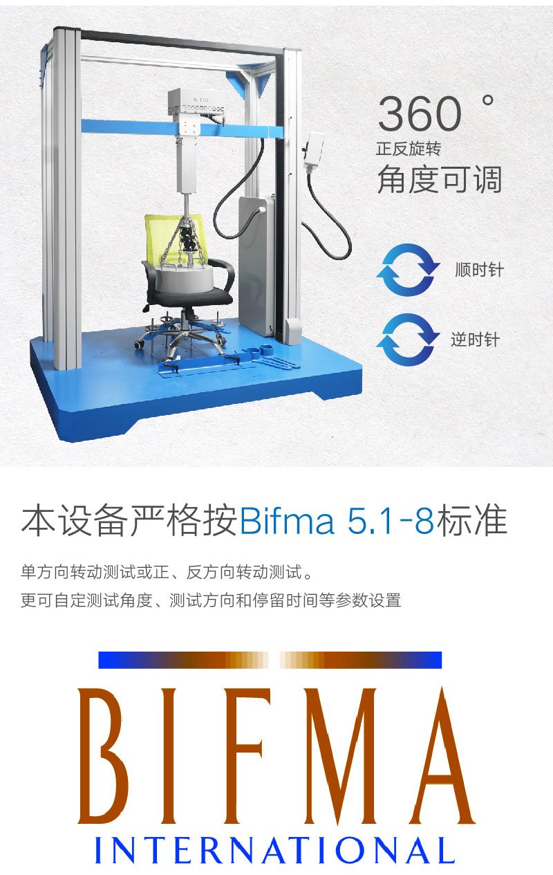 辦公椅旋轉(zhuǎn)壽命試驗(yàn)機(jī)適用于椅面具有旋轉(zhuǎn)功能的辦公椅,用于評估辦公椅子抵受重復(fù)旋轉(zhuǎn)的壓力及磨損 1、 可設(shè)定正轉(zhuǎn)和反轉(zhuǎn)角度(45°到355°) 2、 單向360°旋轉(zhuǎn)。 | ||