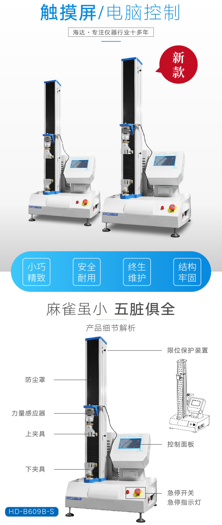 指標參數(shù)容量5kg,10kg,15kg,20kg,30kg,50kg,100kg,200kg,可選電機400w松下伺服電機驅(qū)動器400w松下伺服驅(qū)動器絲桿進口滾珠絲桿控制方式面板控制(觸摸屏),可連電腦速度可調(diào)0.1-500mm/min最大行程900mm(不含夾具)荷重分解度1/250,000荷重精度≤0.5%單位切換gf/kgf/N//kN/LBf/T外形尺寸520*515*1250mm(L*W*H)凈重約70KG電源AC 220V整機功率500W 海達多功能拉力試驗機型號用途對比以下多功能材料試驗機可進行:抗拉強度、抗壓強度及伸長量,可做剝離、撕裂、抗彎、抗折、壓縮等試驗。適用:膠帶、標簽、膠黏劑、保護膜、鍍層、金屬、電子、電線電纜、防水卷材、PCB材料、鋁合金、編織袋、塑料、橡膠、無紡布、安全帶等很多行業(yè)材料。型號款式特點容量1kg=9.8N測試功能適用材料HD-B602單柱電子式,經(jīng)濟型200kg拉伸、壓縮、彎曲、撕裂、延伸率、剝離、剪切、粘接力、高粘剝離測試端子拉力、塑料件拉伸、密封圈……HD-B609單柱電腦式 雙顯200kg薄膜、塑料、離型紙/膜、膠帶、紙張、復(fù)合帶、打包帶、鋁箔、保護膜、鋁塑板……HD-B609B-S單柱電腦伺服式200kg薄膜、離型紙/膜、膠帶、紙張、復(fù)合帶、打包帶、鋁箔、保護膜、鋁塑板、鏡片(抗壓)、吸波材料(抗壓)……HD-B617 單柱電腦式雙顯500kg線束、端子、橡膠、塑料……HD-B617-S單柱電腦伺服式500kg線束、端子、橡膠、塑料……HD-B603雙柱 門式電腦式2T拉斷、拉伸、抗壓、三點抗彎、四點抗彎曲測試 、撕裂、剪切等 電線電纜、木材、某些金屬、塑料、打包帶、背包、塑料桶(抗壓)、焊接點、安全帶(拉伸)、防水卷材(拉伸)……HD-B604-S雙柱門式電腦伺服式2T電線電纜、橡膠、鏈輪、PVC手套、木材、打包帶、某些金屬、焊接點、木地板鎖扣 ……HD-B604B-S雙柱門式電腦伺服式2T電線電纜、橡膠、鏈輪、PVC手套、木材、打包帶、某些金屬、焊接點、木地板鎖扣、安全帶(拉伸)、防水卷材(拉伸)……HD-B615-S雙柱門式電腦伺服式5T金屬、鋼絲、鋼絲繩……HD-B612-S雙柱門式電腦伺服式10T~30T拉伸、壓縮、彎曲、粘合、剪切、環(huán)剛度、彈簧拉壓金屬板材、鋼絲、鋼管、鋼板、鋼筋……HD-B616雙柱門式油缸下置式30T/60T/ 100T抗拉、抗壓、屈服強度等金屬板材、鋼絲、鋼管、鋼板、鋼筋……HD-B607-S雙柱門式高低溫環(huán)境 電腦伺服式3T高低溫、抗拉、抗壓等塑料、橡膠……夾具提示:200多款不同夾具,具體需依據(jù)客戶具體測試樣品選型。備注:以上參數(shù)僅供參考,為對客戶負責,具體材料選型請以銷售溝通后為準。 產(chǎn)品特點 (一)結(jié)構(gòu)特點 1.機殼采用A3鋼板,使用精密激光切割及數(shù)控折床彎折、焊接成型,附著光澤白與金屬藍配色的烤漆涂裝; 2.采用雙顯雙控的操作系統(tǒng),可連接電腦通過軟件進行試驗,也可通過觸摸屏設(shè)置參數(shù)進行試驗; 3.柔性風琴式一字防護罩,質(zhì)感輕柔,有效防止因材質(zhì)過硬,摩擦產(chǎn)生振動所帶來的過大異響; 4.設(shè)備采用行星減速機,具有效率高、運轉(zhuǎn)平穩(wěn)、噪聲低、適應(yīng)性強等特點。 (二)測試系統(tǒng) 1.多通道測力系統(tǒng),可同時校準四個傳感器,適用多種量程傳感器選配; 2.配置松下伺服電機系統(tǒng),搭配精密滾珠絲桿多軸定位技術(shù),位移精度0.5級,傳動系統(tǒng)效率高、傳動平穩(wěn); 3.控制器采用我司自主研發(fā)力值測試軟件,可完成參數(shù)設(shè)定、運行狀態(tài)控制、數(shù)據(jù)收集、分析處理及監(jiān)控、結(jié)果報表輸出; 4.軟件有英語、中文簡體與繁體三種語言形式可選,使用方便; 5.限位保護、過載保護、自動回位等智能設(shè)計,保證操作安全。 | ||
