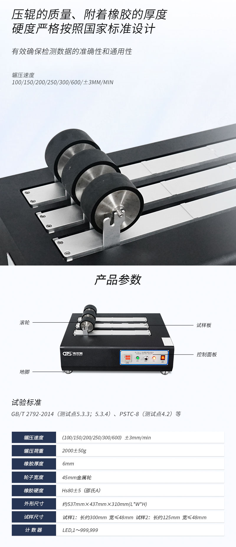主要用于:專業適用于塑料薄膜、膠粘劑、膠粘帶、不干膠、醫用貼劑、離型紙、保護膜、金屬箔、隔膜、無紡布橡膠、紙張等產品的剝離強度、持粘性。以壓輪本身之重量,碾壓膠帶試片,使試片密合貼于試驗板上,以作為粘著保持力試驗制樣工具。