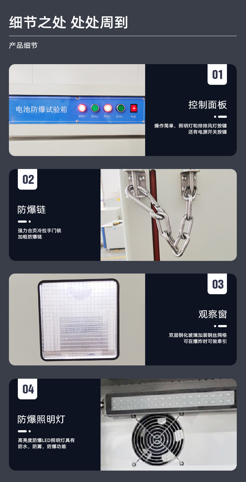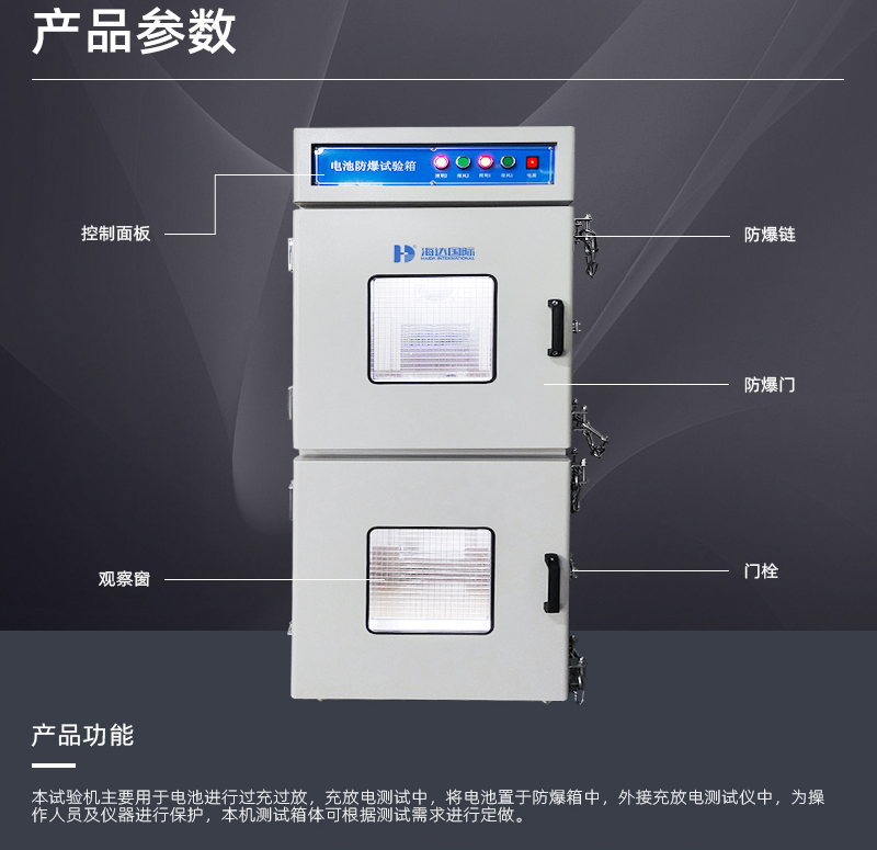 1、每層測試箱尺寸:500*500*500mm(長*寬*高);(也可根據(jù)客戶要求定做) 2、材質(zhì):外箱:1.5mm 厚A3鋼板并經(jīng)烤漆處理, 內(nèi)箱: SUS#201 不銹鋼,厚1.2mm; 3、單開門,雙層門,內(nèi)箱門為不銹鋼材質(zhì),并加硅膠迫緊條,門上開有觀察窗; 4、門由強力合頁與箱體相連,防爆冷拉手門鎖; 5、觀察窗: 在每個測試箱體正面開有250x250mm的透明觀察視窗,便于觀察測試箱體內(nèi)測試產(chǎn)品的狀態(tài); 6、試驗箱體內(nèi)部加貼鐵氟龍膠布,有效絕緣并有效阻燃,易清理; 7、每層箱體右側(cè)開有一個直徑50mm圓形測試孔,便于測試連接線通過; 8、單獨測試面板控制各個測試室內(nèi)的照明及排氣,遇有煙火時箱內(nèi)排風扇自動開啟排煙。 | ||