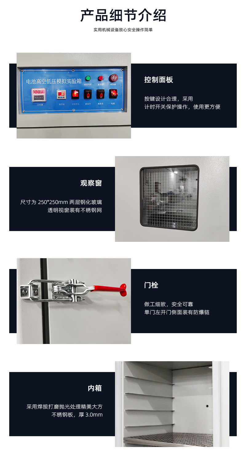 1內(nèi)箱材質(zhì): SUS201# 不銹鋼,厚度3mm; 2、外箱材質(zhì): A3 冷板烤漆, 厚度1.5mm; 3、壓力范圍: 0.5~100Kpa,常用測試氣壓11.6 Kpa; 4、內(nèi)箱尺寸: W400xH400xD400mm 5、外箱尺寸: W550xH1200xD550 6、置物隔板材質(zhì):不銹鋼; 7、真空度顯示:數(shù)顯式真空表控制,準確顯示真空度,易于設置真空度; 8、計時器: LED數(shù)顯, 在0-9999H內(nèi)自由設置可(H/M/S秒可切換); 9、 壓力波動:≤5%; 10、 設備使用電源:AC220V,50HZ,2.2KW; | ||