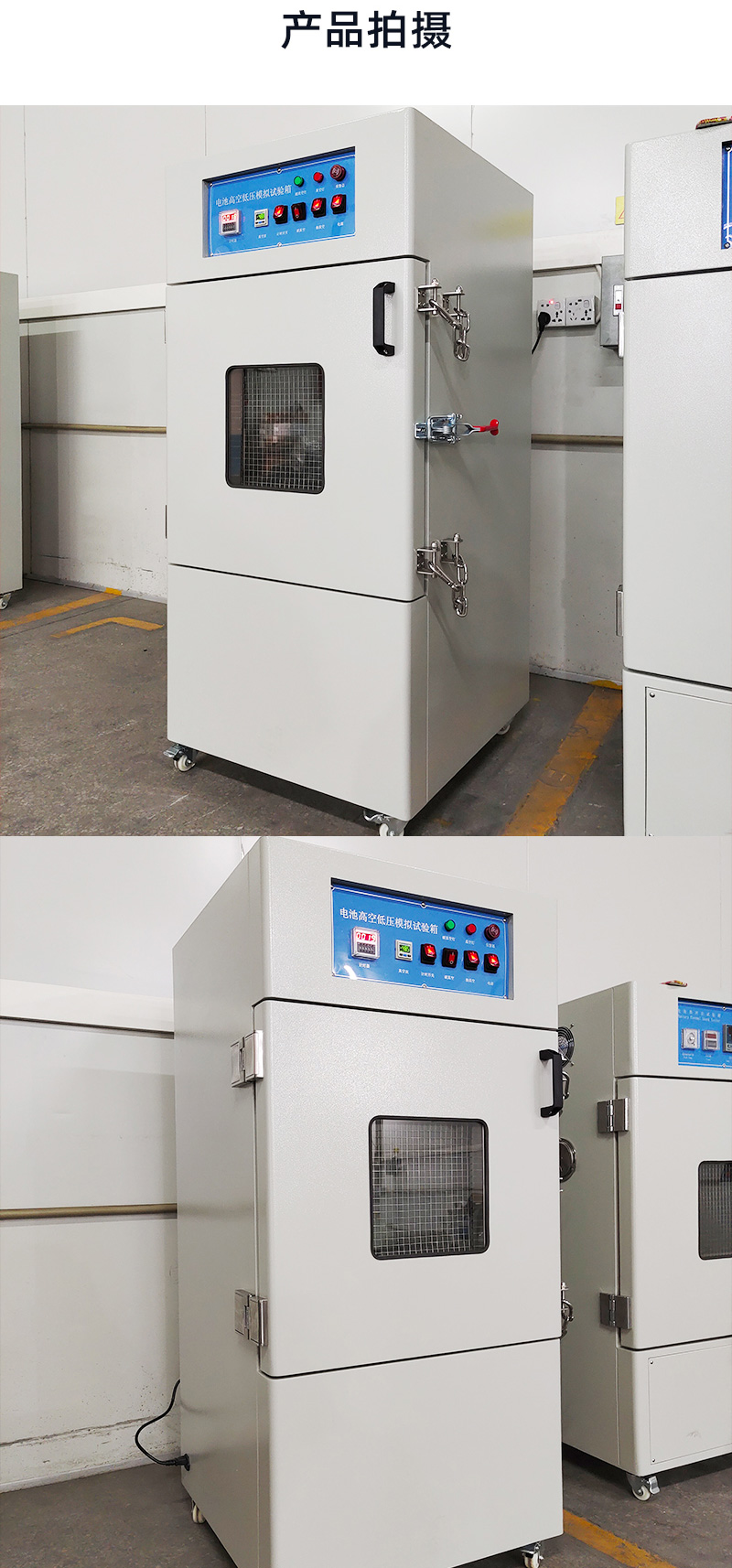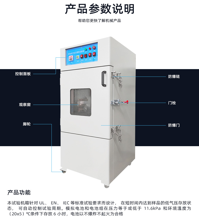 本試驗機箱針對UL、EN、IEC等標準試驗要求而設計,在短時間內(nèi)達到樣品的低氣壓存放狀態(tài),可自動控制試驗周期,全程監(jiān)控箱內(nèi)氣壓變化,實現(xiàn)試驗的自動終止。模擬電池和電池組在壓力等于或低于11.6kPa和環(huán)境溫度為(20±5)℃條件下存放6小時,如果電池無滲漏,無排氣,無解體,無破裂和無起火,并且每個實驗電池或電池組在試驗后的開路電壓不小于其在進行模擬實驗前的電壓的90%,即為合格。 滿足標準:GB/T 31485-2015,GB/T 31241-2014,UN38.3,IEC62133,QC/T743-201X,GB/T 8897.4-2008,GB/T 21966-2008 | ||