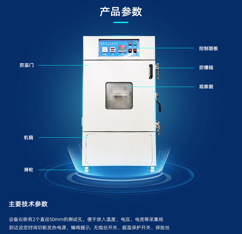 1、內箱尺寸:400x400x450mm(寬x深x高) 2、外箱尺寸:650x550x1100mm(寬x深x高) 3、溫度范圍:常溫~200℃ 5、溫度顯示精度:0.1℃ 6、溫度穩定度:±1.0℃ 7、溫度均勻度:±2℃ 8、升溫時間:(5±2)℃/min,(平均升溫,非線性空載) 9、溫控表:可編程溫度控制器,可實現升溫總時間控制,不同于普通溫控表。 儀器結構: 10、內箱材質:不銹鋼板 11、外箱材質:冷軋鋼板烤漆 12、保溫材質:壓縮玻璃棉 13、保溫裝置:無熔絲開關、超溫保護開關、保險絲 14、使用電源:1∮,220V,20A 15、安全裝置:次超溫報警,MCCB過載保護等 16、排氣煙道:葉片式設計可調出風量 17、控制形成:電池熱沖擊試驗箱溫度到達設定溫度后自動打開時間計,時間到達后切斷發熱電源,蜂鳴提示 18、送風循環系:對流式送風循環系統 19、控制系統:溫到計時,時到停機、蜂鳴提示。 | ||