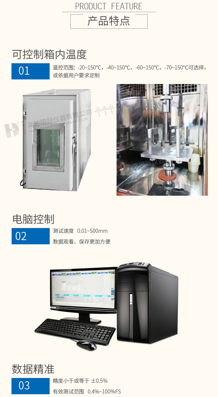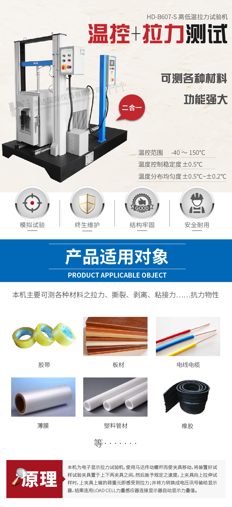 高低溫拉力試驗機HD-B607-S適用于橡膠,塑料異型材,塑料管材、板材、片材,薄膜、電線電纜、防水卷材、金屬絲等材料在高溫或低溫環境下進行拉伸測試。 設計標準:GB/T 16491、GB/T 1040、GB/T 8808、ASTM D6644、ASTM D5035、ASTM D2061、QB/T 2171、JIS K6854 | ||