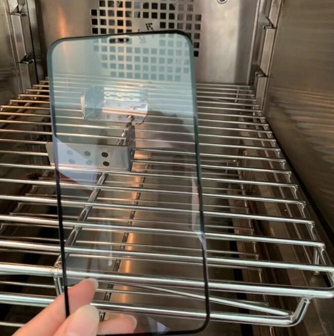 步驟3:到時間后觀察試驗樣品,對其形狀、粘性、是否起泡等各方面進行觀察。可以看到由于溫度過低箱內在開門的瞬間已經結有薄薄的結晶了,但是!我們的鋼化膜,還是完好如初,絲毫沒有受到溫度影響,