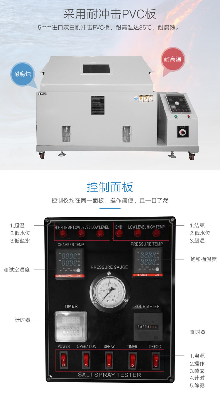 (3) KOWINTEST銅鹽加速醋酸鹽霧試驗(yàn)(CASS試驗(yàn))是國(guó)外新近發(fā)展起來(lái)的一種快速鹽霧腐蝕試驗(yàn),試驗(yàn)溫度為50℃,鹽溶液中加入少量銅鹽—氯化銅,強(qiáng)烈誘發(fā)腐蝕。它的腐蝕速度大約是NSS試驗(yàn)的8倍。