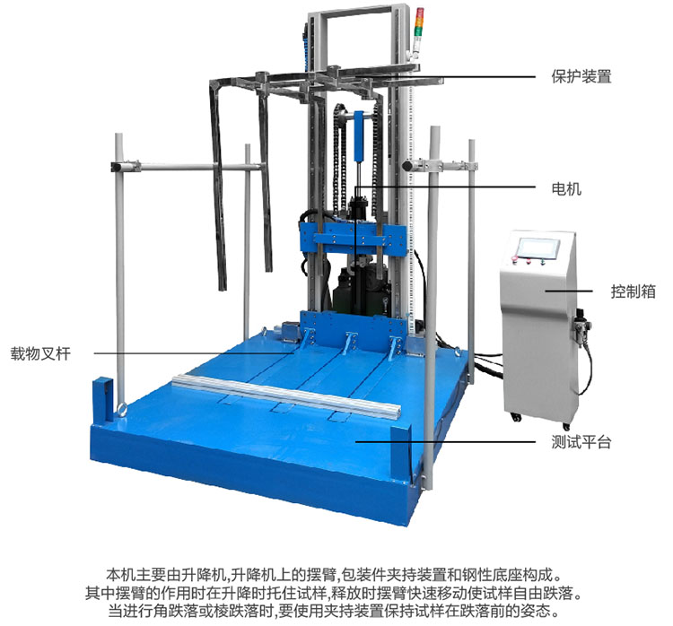 1、試件滿載重量:500KG、1000KG; 2、測試空間:1200*1400*2200mm(可定制); 3、測試高度:0-1000mm任意設定可調; 4、測試方式:棱、角、面; 5、驅動方式:電機、氣缸驅動; 6、保護裝置:上、下設有感應型保護裝置; 7、沖擊板材質:45#鋼材,實心鋼板; 8、高度顯示:觸摸屏操作; 9、傳動方式:氣動加速裝置+臺灣進口直線滑塊+銅質導套+45#烙鋼 10、托臂結構:45#鋼材,方通焊接而成; 11、跌落高度:采用高精度編碼器控制; 12、外形尺寸(L*W*H):2130*1300*2470mm; 13、控制箱尺寸(L×W×H):350×350×1100mm; 14、電源:220V/50HZ; | ||
