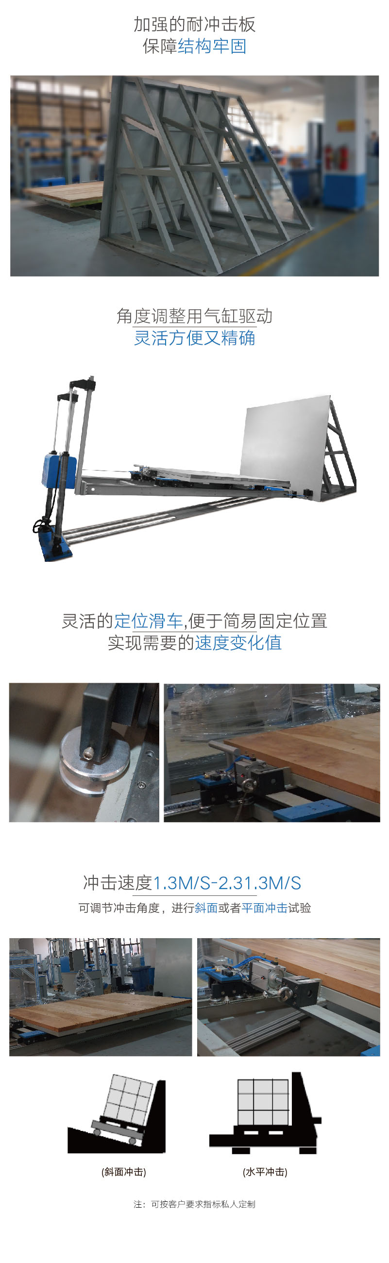 控制方式 PLC控制 顯示方式 觸摸屏顯示 數據輸出 USB輸出 負載 ≤500 kg 軌道平面與水平面夾角 10° 沖擊面板尺寸 鋼板1600mm×2000mm×20mm 最大滑行長度 2000mm 沖擊速度 1.1~2.3 m/s 沖擊速度誤差 ≤±5% 滑車臺面尺寸 50mm厚實木板:1500mm×1500mm(L*W) 試樣 適用于各類包裝材料/冰箱/桌椅/箱柜等 試樣尺寸 最大約1500mm×1500mm×1500mm(L*W*H) 儀器外形尺寸 約6990mm×1600mm×1980mm(L*W*H) 提升機功率 1.5kW 液壓單元組合 1.5kW(2HP) 40L油箱 重 量 約2700kg 氣 源 ≥0.6MPa 電 源 3∮ AC380V 整機功率 約3.1kW 主要測試項目 各類包裝材料/冰箱/桌椅/箱柜等的斜面滑動抗沖擊損壞的能力 | ||